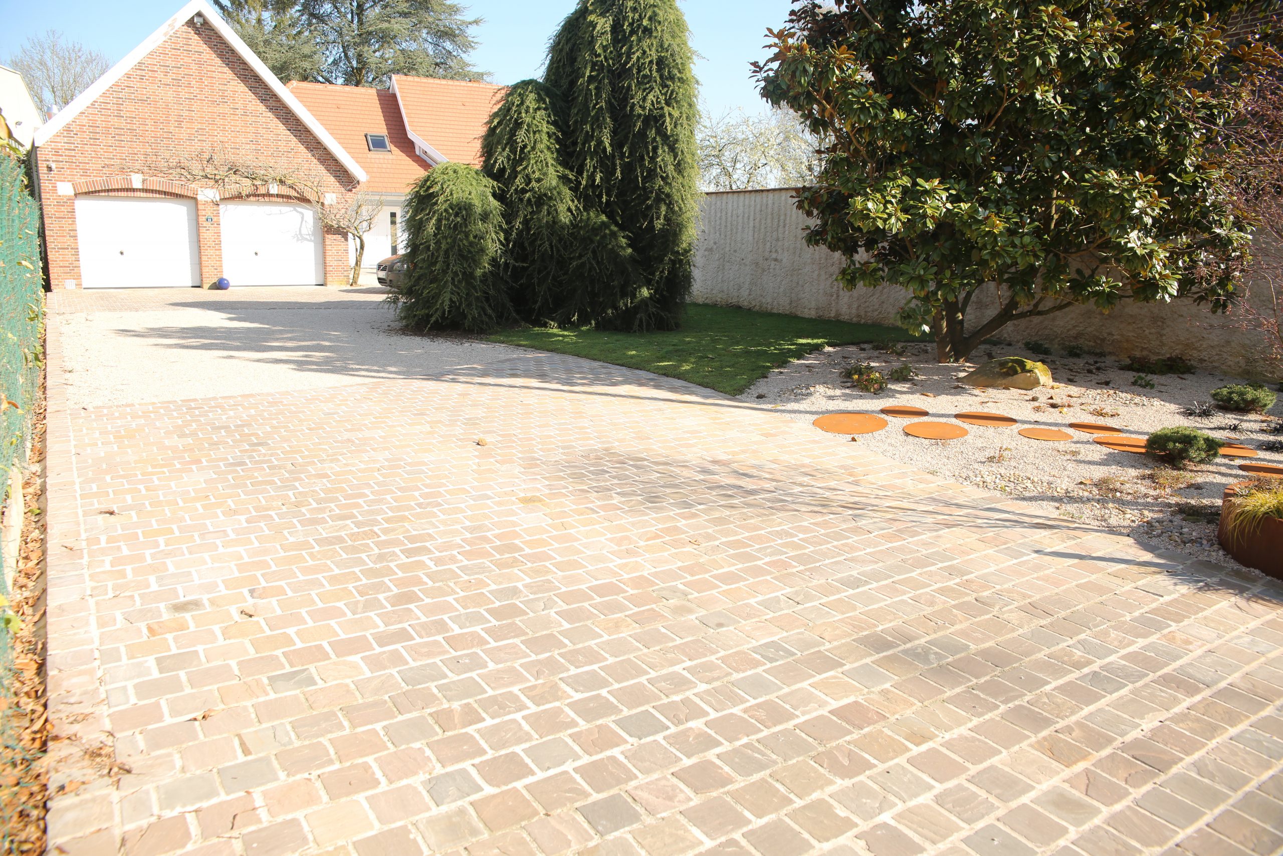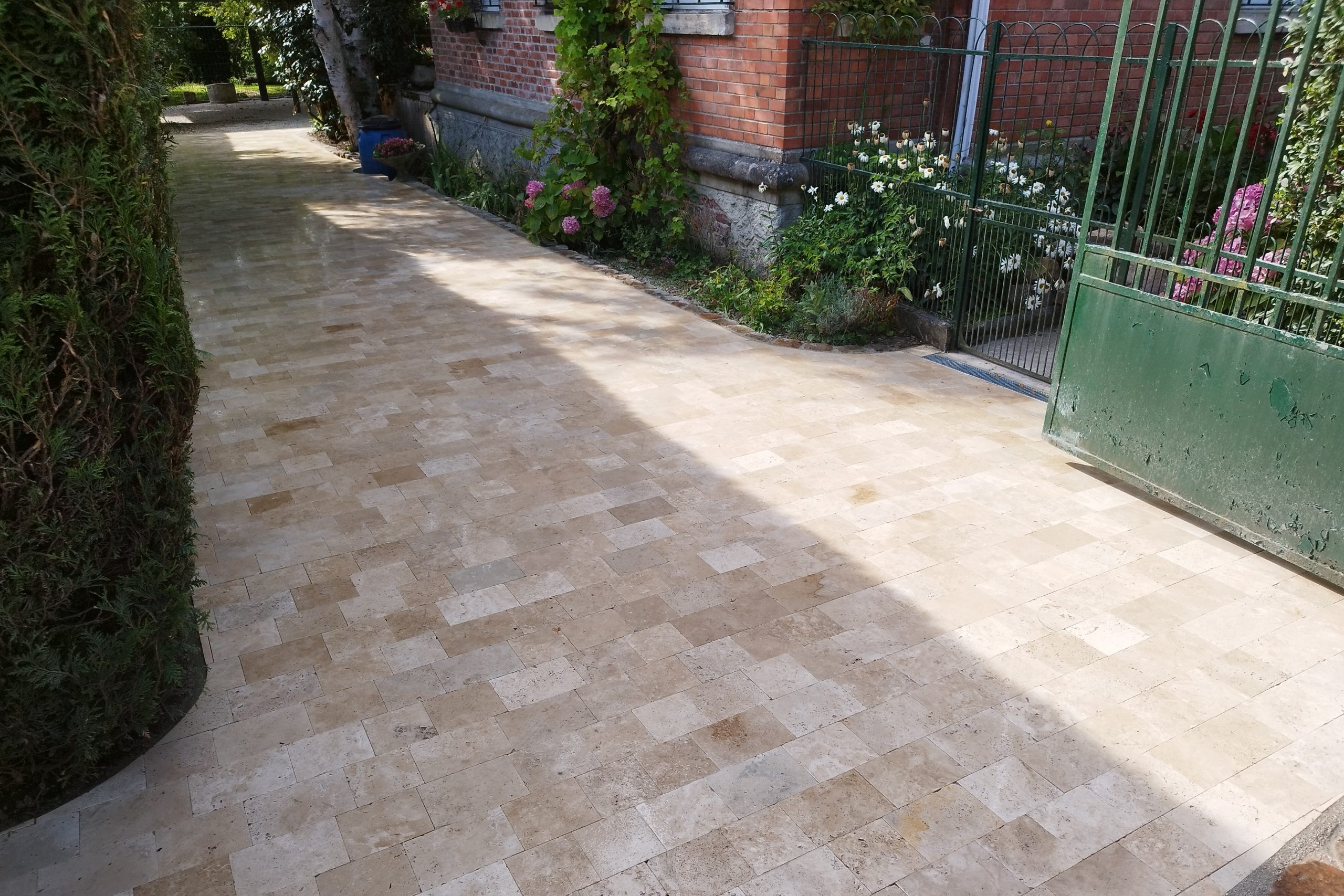Pour les accès carrossables, la pierre naturelle est également une excellente option. Pavés en grès, en pierre bleue ou en travertin résistent au poids des véhicules tout en offrant un rendu élégant. Leur surface stable et drainante évite la formation d’ornières et limite l’accumulation d’eau.
