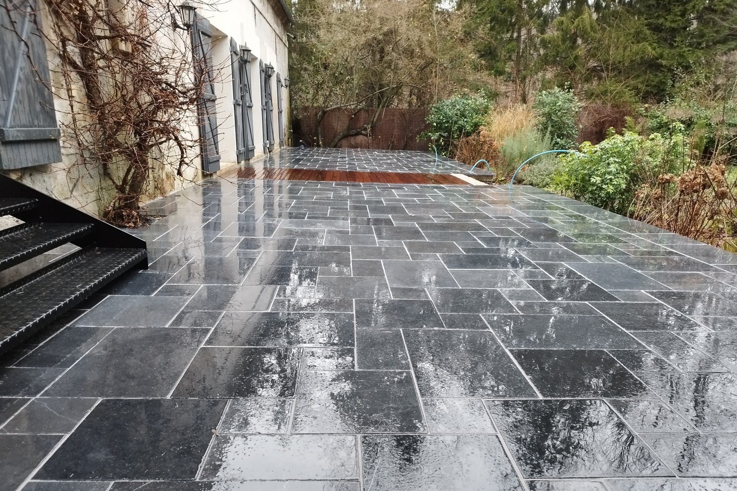 La pierre offre également un confort d’usage : elle ne chauffe pas excessivement au soleil et reste agréable sous les pieds. Selon le type choisi (granit, travertin, ardoise, calcaire), le dallage peut être antidérapant. Il limite ainsi les risques de glissade, même par temps humide ou aux abords d’une piscine.